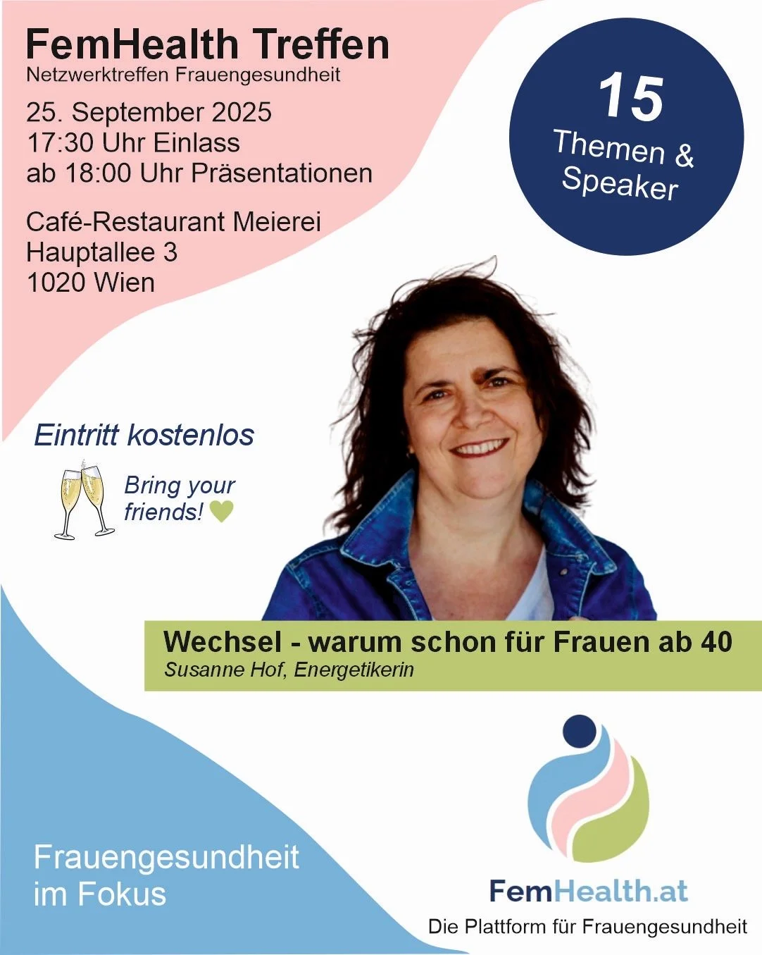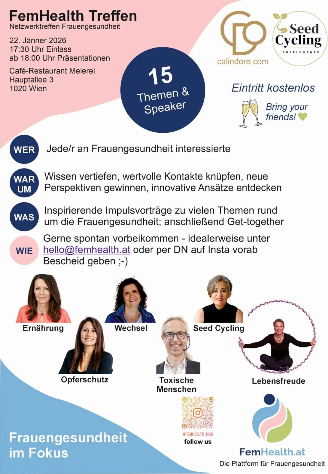 Komm zu unseren Networking-Events und werde Teil einer inspirierenden Community! Dich erwarten spannende Vorträge zu verschiedenen Themen rund um Frauengesundheit, wertvolle Einblicke und die Möglichkeit, dich mit Expertinnen, Unternehmen und anderen interessierten Frauen auszutauschen. Knüpfe neue Kontakte, finde Gesundheitspartnerinnen oder einfach inspirierende Gespräche. Egal, ob du beruflich in diesem Bereich tätig bist oder einfach mehr über deine Gesundheit erfahren möchtest – du bist herzlich willkommen! Wir freuen uns auf dich!